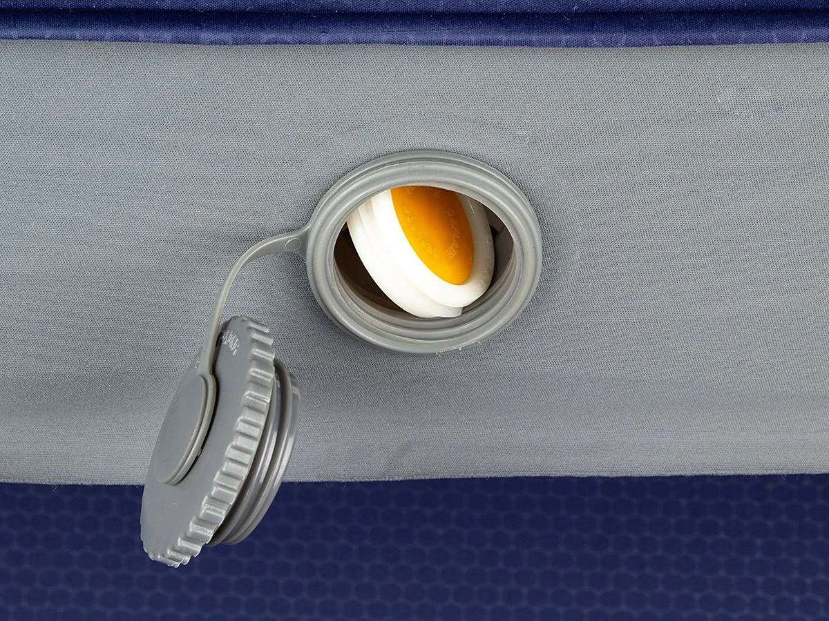 Die Schlafmatte ist mit einem 2-Stufen-Ventil ausgestattet, das in der einen Einstellung nur Luft einlässt und in der anderen Einstellung die Luft herauslässt. Die Schlafmatte wird mit einem Kompressionsband und einer Nylontragetasche mit Kordelzug geliefert.