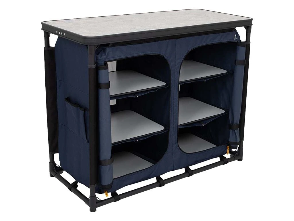Eine stilvolle Kücheninsel mit Windschutz aus der Industrial-Kollektion. Ausgestattet mit einem extra robusten dunkelblauen 600-Denier-Polyesterbezug, der 6 praktische Einlegeböden enthält. Die Arbeitsplatte in Betonoptik ist hitzebeständig, wasserfest und für einen 4-Flammen-Gasherd geeignet. Die verstellbaren Füße können individuell eingestellt werden, so dass das Regal auf jedem Untergrund stabil steht. Wird in einer Tragetasche geliefert.