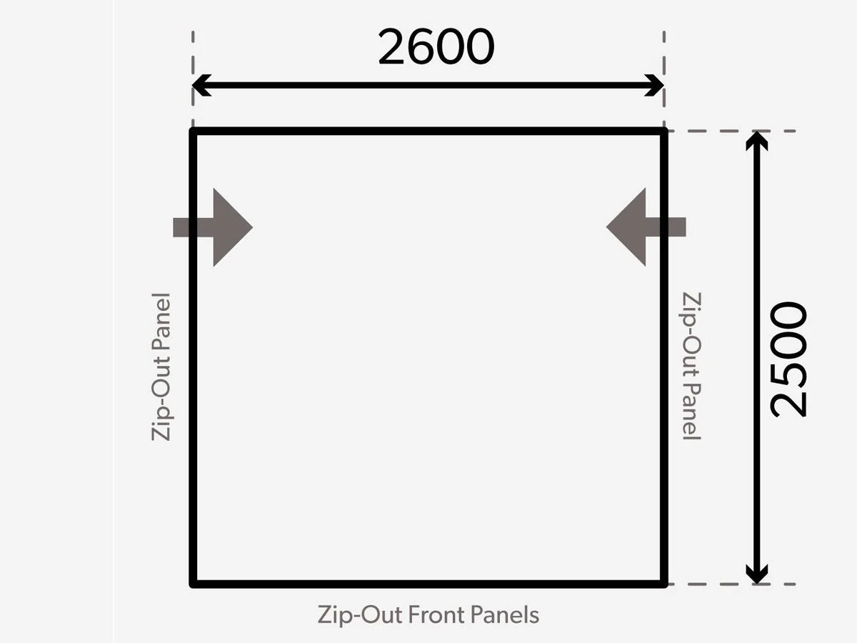 Das Vorzelt ist 260 cm breit. Das bedeutet, dass Ihr Wohnwagen über eine gerade Schiene von mindestens 260 cm verfügen muss, um das Vorzelt aufstellen zu können. Sie möchten das Vorzelt in die Schiene Ihrer Markise schieben? Dann muss die Markise mindestens 300 cm lang sein.