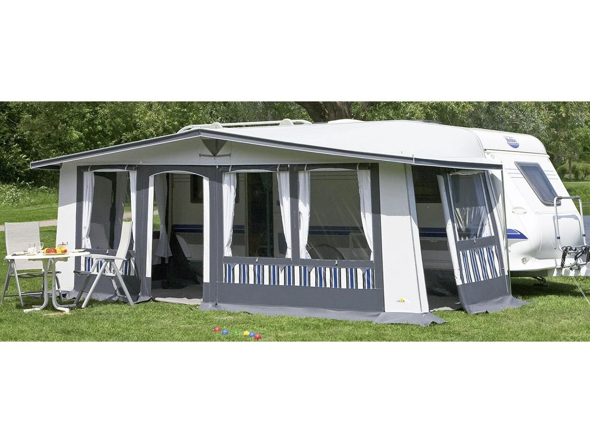 Die Seitenwände mit seitlich wegrollbarer Eingangstür sind herausnehmbar. Die Fenster (Gaze-/Folienfenster) sind mit Gardinen bestückt und durch doppelte Fensterklappen verschließbar: Beide senkrecht mit Reißverschluss; senkrechte Reißverschlüsse der außenliegenden Fensterklappe mit zusätzlicher Abdeckung. Senkrechter und waagerechter Hohlsaum für Sturmgestänge mit Klettverschluss. An der rechten Seite ist ein Erkeranbau möglich.