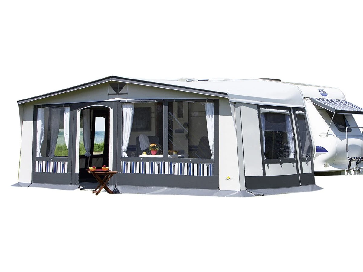 Dach, Vorder- und Seitenwände aus hochwertigem, beidseitig kunststoffbeschichtetem Polyestergewebe, wetterecht, lackiert und komplett abwaschbar; die verarbeitete Fensterfolie des Caravanzelt absorbiert 90 % der UV-Strahlung.