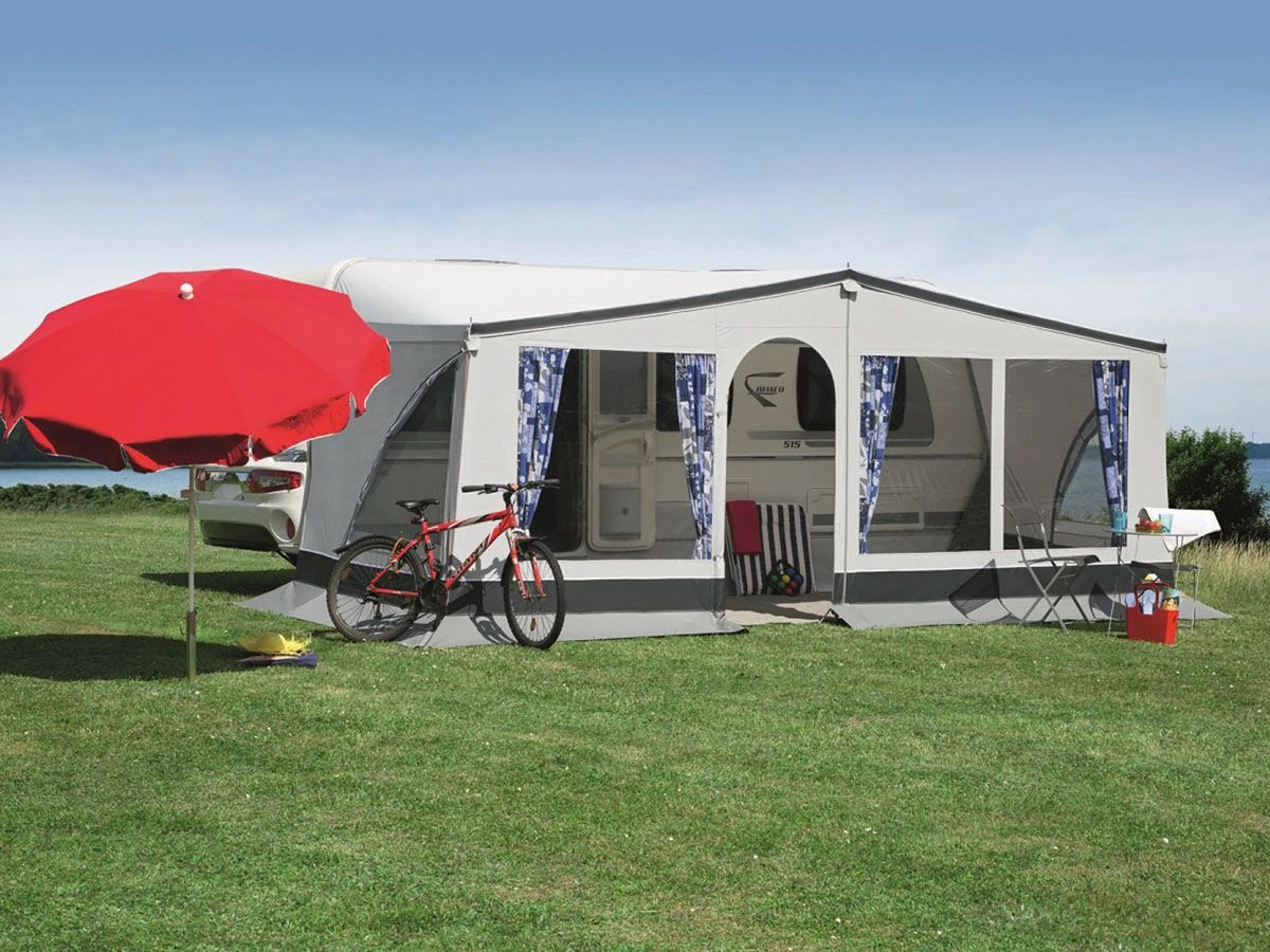 | Inklusive | Heringe, Aufbewahrungstasche, Abspannleinen, Gardinen, Gerade Radkastenabdeckung für einachsigen Wohnwagen, Zeltspanngummis, Gestänge |