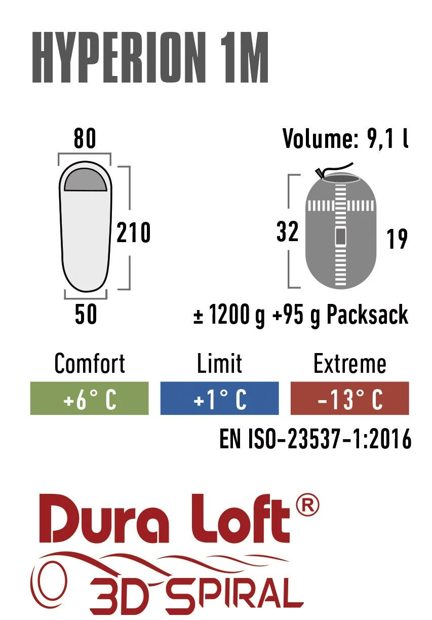 Der Außenbezug ist mit dem PFC-freien BIONIC-FINISH®ECO ausgerüstet. Diese umweltfreundliche und nachhaltige Ausrüstung ist schmutz- und wasserabweisend. Der Hyperion 1M ist ein hochwertiger, funktionaler 3-Jahreszeiten (Frühjahr / Sommer / Herbst) Mumienschlafsack mit großem Einsatzbereich für Camping, Wandern, Trekking-, Berg- und Rucksacktouren. Die hochwertige Dura Loft® 3D Spiral-Kunstfaser-Hochbausch-Füllung hat eine ausgezeichnete Wärmeleistung. Die Spiral-Hohlfaser ist reißfest und zusätzlich thermisch versiegelt und silikonisiert damit eine gute Komprimierbarkeit und Bauschfähigkeit gewährleistet ist. Der hochwertige und strapazierfähige Nylon Rip-Stop Außenbezug hat im Bodenbereich keine Steppnaht und minimiert Kältebrücken. Das Innenfutter besteht aus einem atmungsaktiven und hautfreundlichen Rip-Stop Nylon. Die verstellbare Kontur-Kapuze und Wärmekragen reduziert Wärmeverlust und bietet mehr Komfort.
