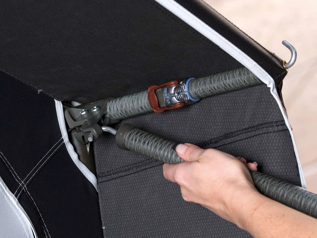 Das Gestänge für des Eclipse Vorzeltvordach ist optional erhältlich. Sie haben die Wahl zwischen einem leichten CarbonX-Gestänge oder dem robusten MegaFrame aus Stahl. Das Gestänge wird mit den Isabella F-Gliedern geliefert, um das Vordachgestänge mit dem Vorzeltgestänge zu verbinden.