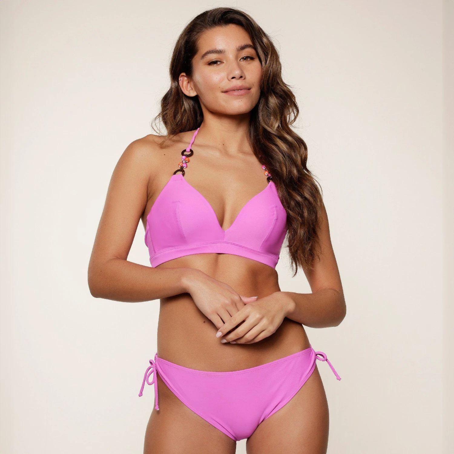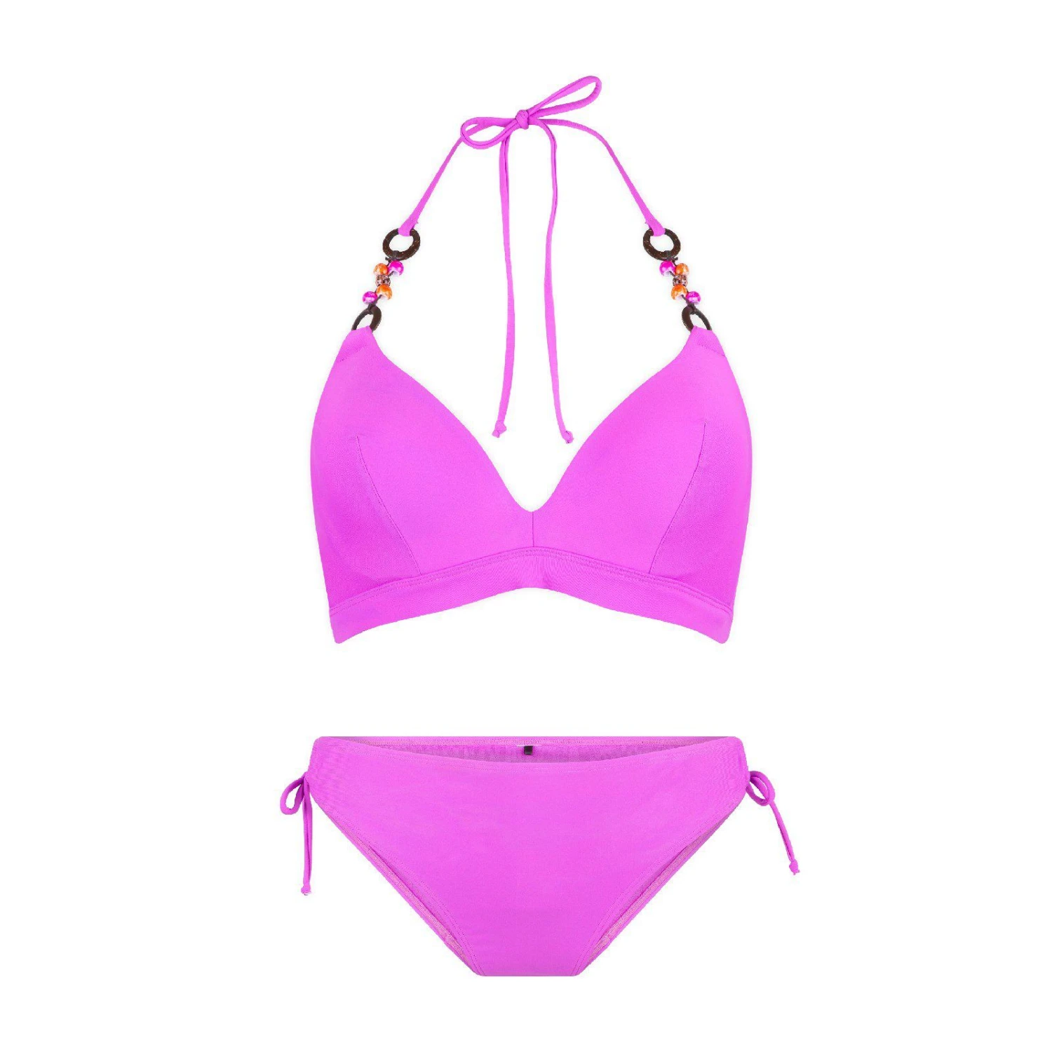 Summer vibes! Mit diesem farbenfrohen Bikini-Set in Pink oder Grün bist du im Handumdrehen startklar! Das vorgeformte Bikini-Top hat einen Neckholder-Verschluss und die Träger sind mit einem verspielten Perlendetails versehen. Der Bikini-Slip hat eine normale Passform mit verstellbaren Seitenbändern für eine perfekte Passform!