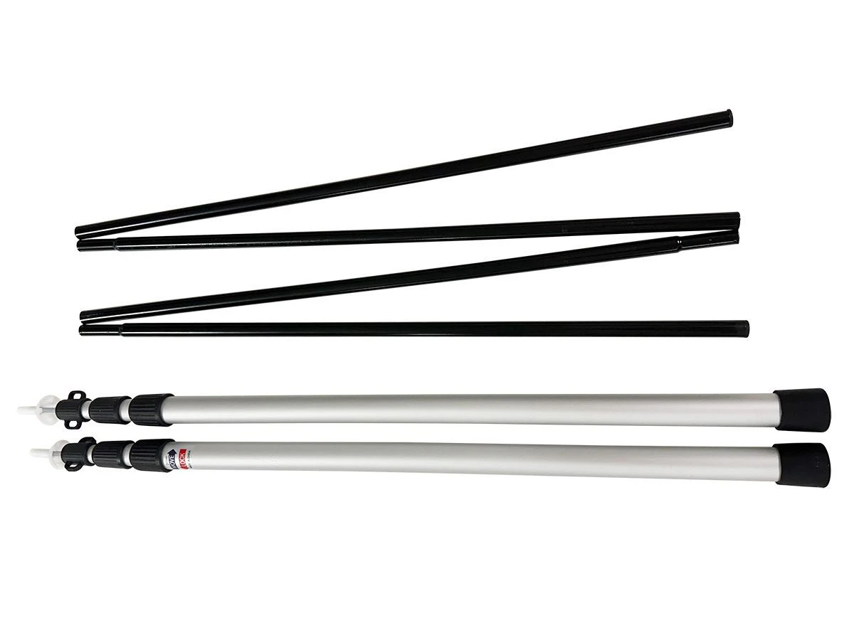 Das Pula wird mit zwei Teleskopstangen, einer Schleusenstange mit Klemmen, Heringen, Abspannseilen und einer praktischen Tragetasche geliefert.