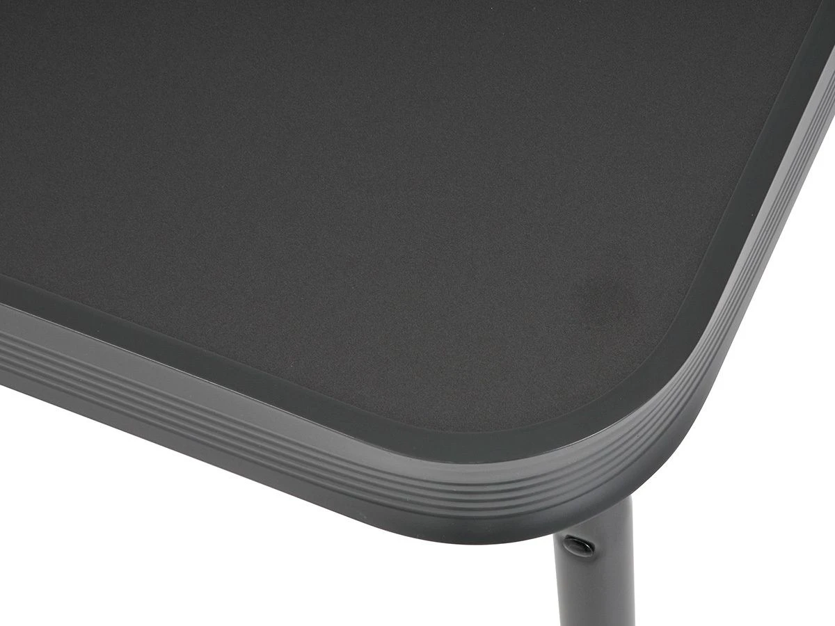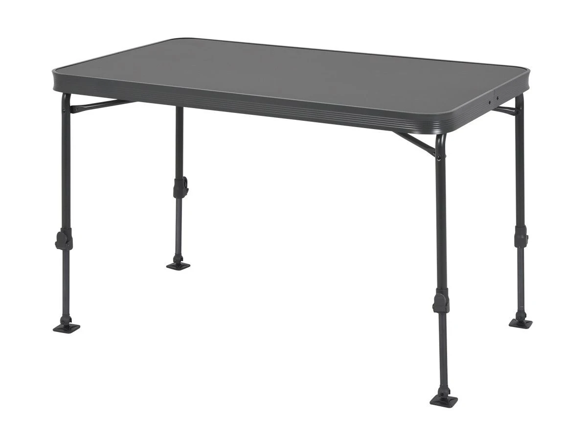 Die Tischplatte misst 115 x 70 cm und ist in der Höhe zwischen 55 cm und 75 cm stufenlos verstellbar. Die Platte ist mit einer Kunststoffwabe und einer Aluminiumkante versehen, was für zusätzliche Stabilität sorgt. Die Tischplatte ist wasser- und hitzebeständig.