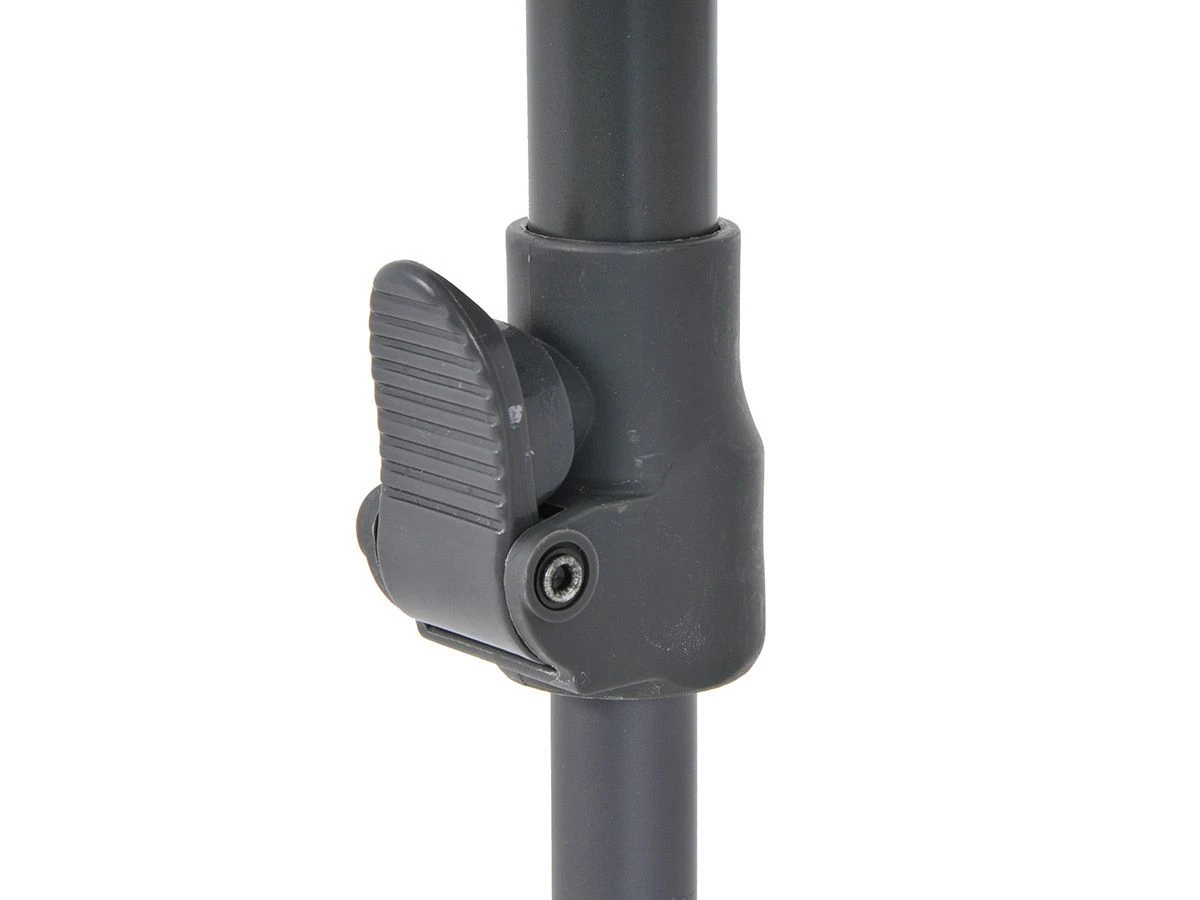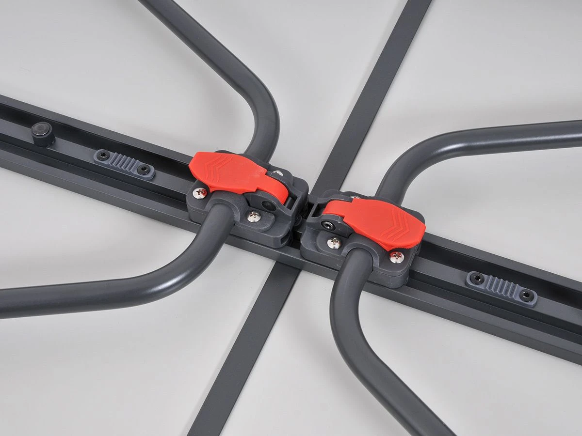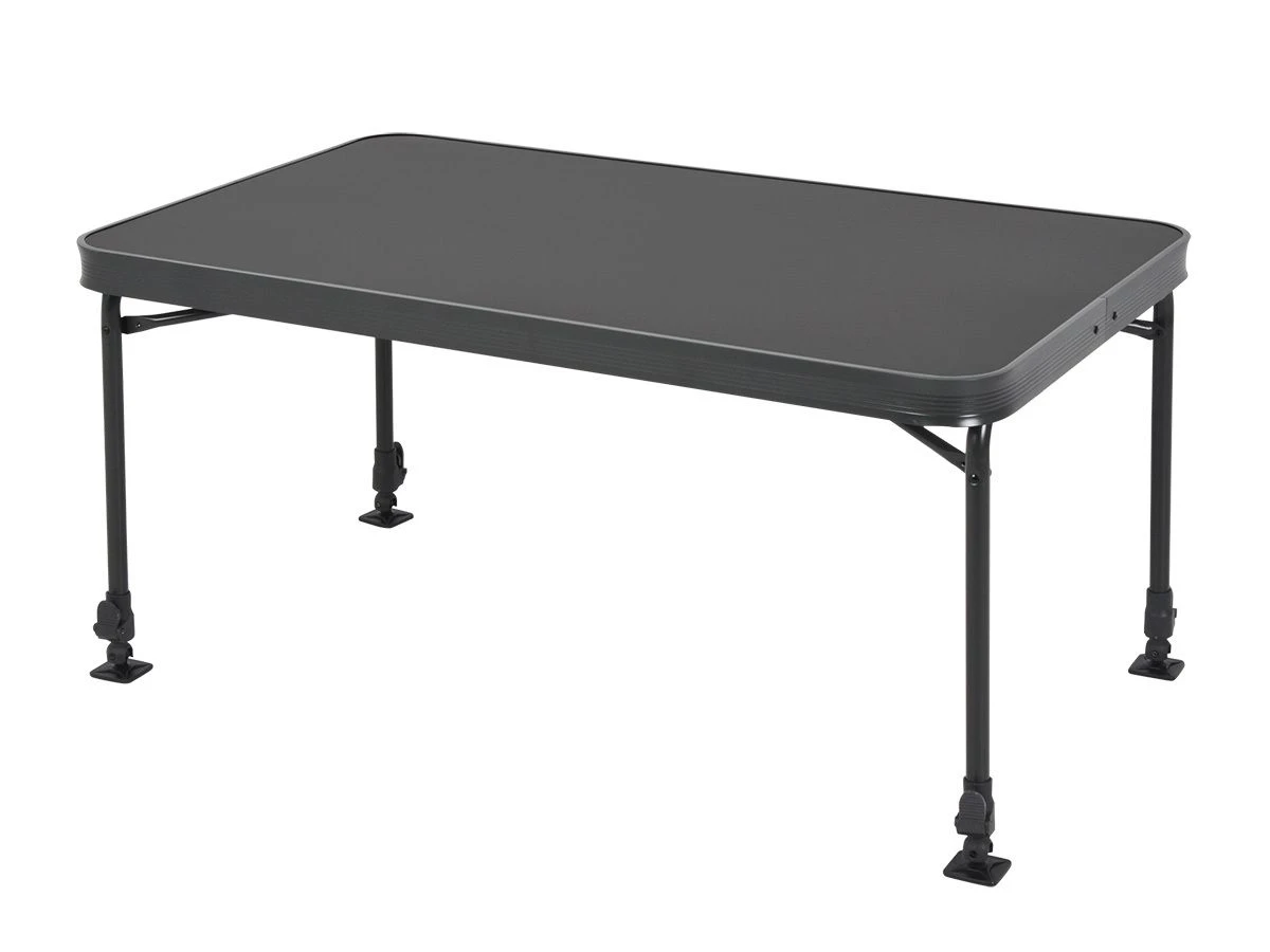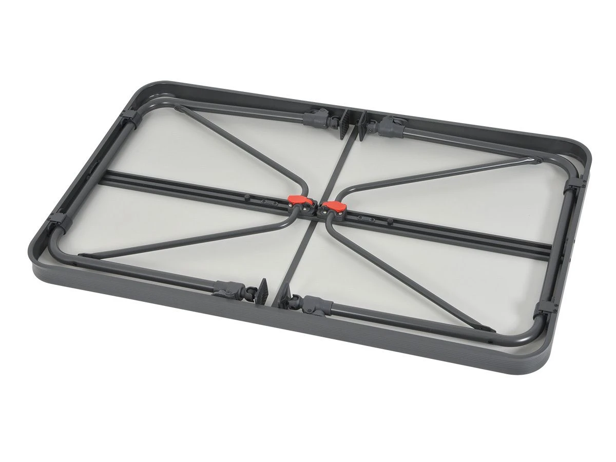 Das Gestell ist aus leichtem Aluminium gefertigt. Wenn die Tischplatte zusammengeklappt wird, liegen die Beine unter der Platte, sodass der Tisch leicht verstaut werden kann. Die Beine sind mit verstellbaren Füßen ausgestattet, dadurch steht der Tisch auf jeder Oberfläche stabil.