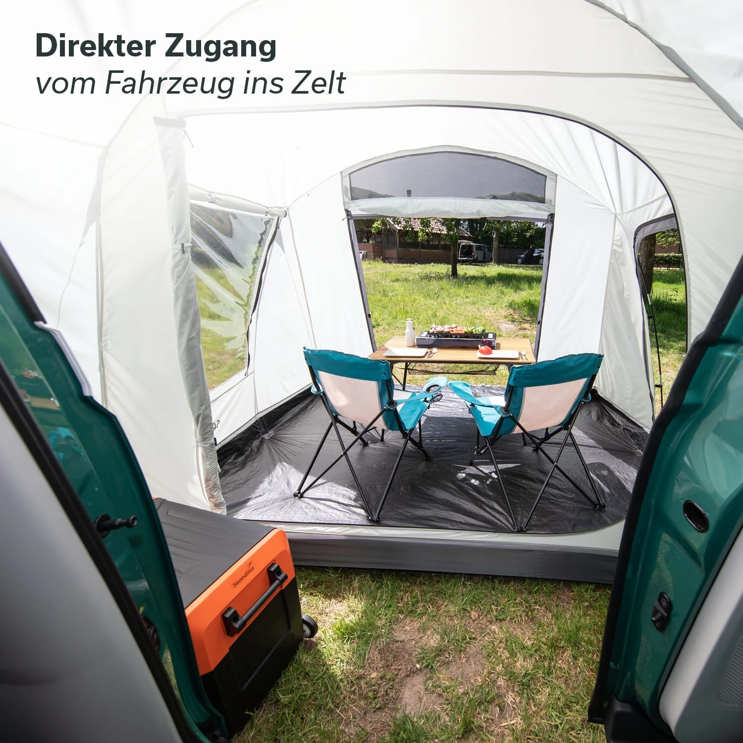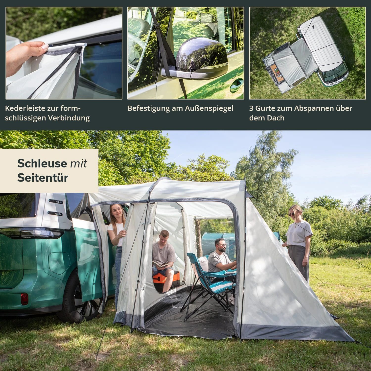Das Auto-Vorzelt ist flexibel in seinen Befestigungsmöglichkeiten für die Schleuse. Eine Kederleiste dient zur formschlüssigen Anbringung an entsprechend ausgerüsteten Fahrzeugen. Oder die Schleuse wird einfach, schnell und unkompliziert mit den drei Gurten am Fahrzeug befestigt, ganz ohne Werkzeuge oder Sonderausrüstung. Zusätzlich ist die Schleuse mit einer seitlichen Tür ausgestattet, um schnell und unkompliziert zum Fahrzeug gelangen zu können, ohne dabei immer durchs Zelt gehen zu müssen.