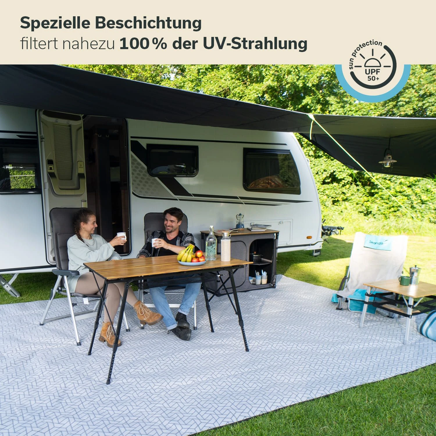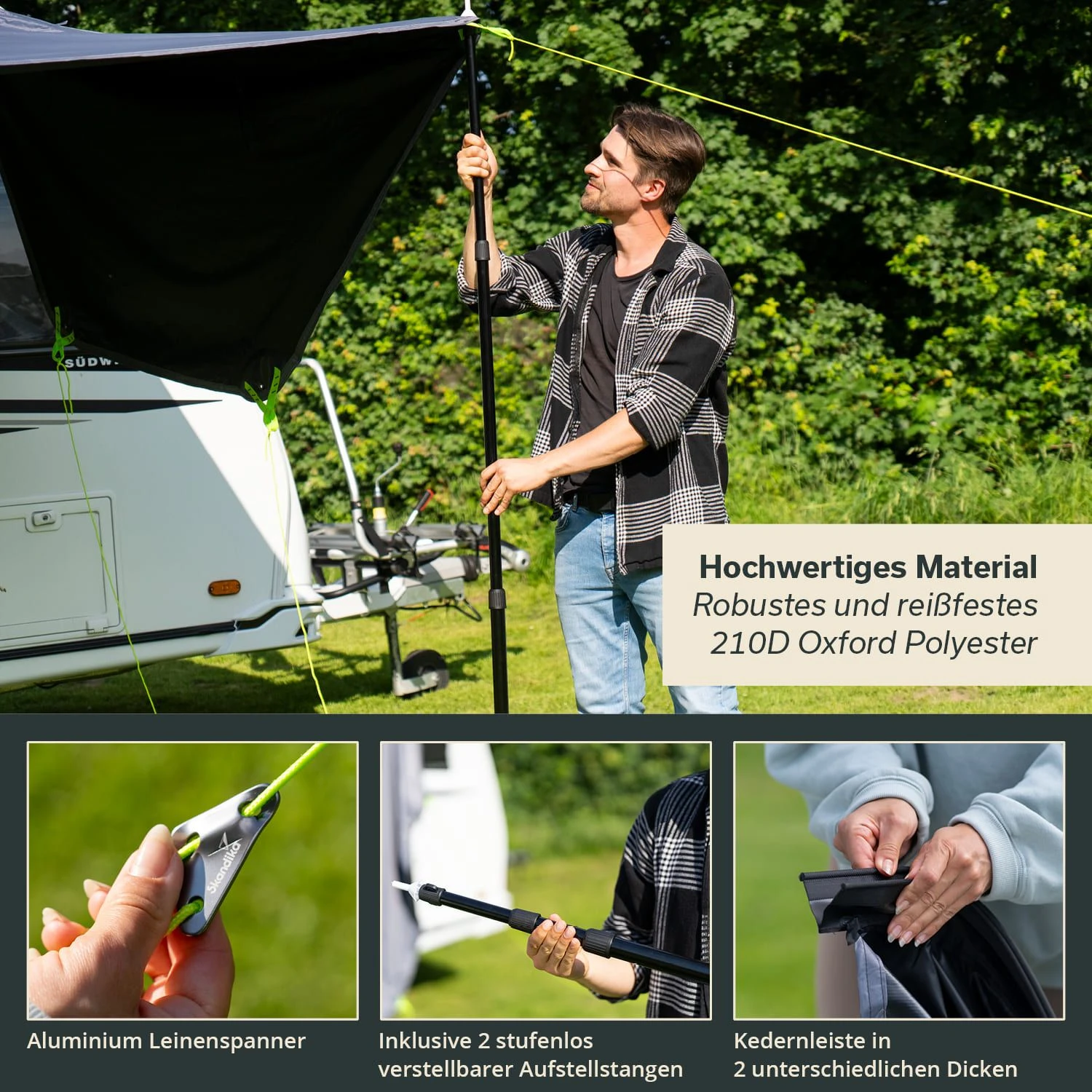 Wer sich einen wettergeschützten Eingangsbereich für den Wohnwagen wünscht, ist bei unserem Skandika Sonnensegel Freeway genau richtig! Das clevere Vordach ist im Nu aufgestellt und befestigt. Es bietet somit genau den Schutz, den Urlauber mit einem Wohnwagen so sehr schätzen.