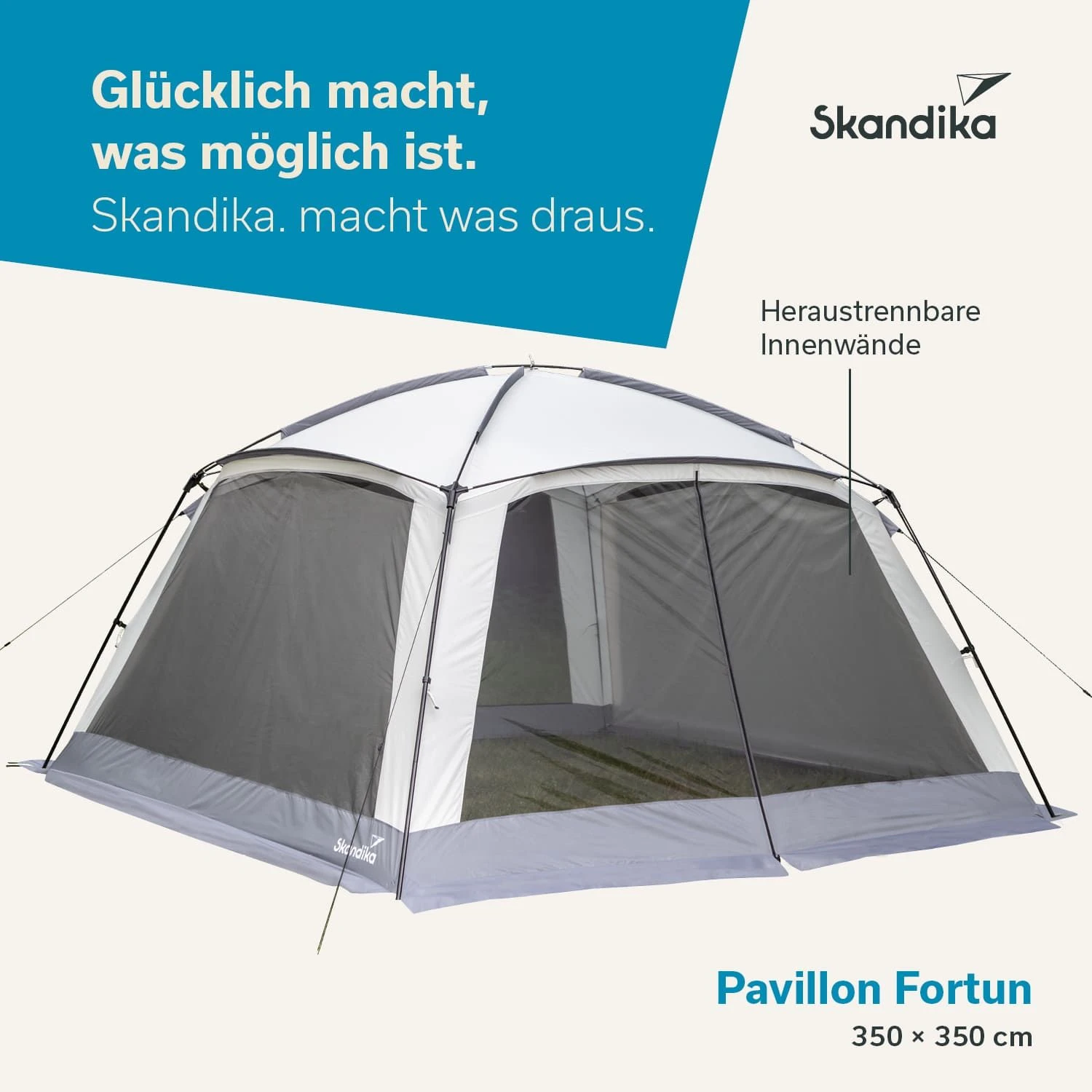 Das Skandika Pavillon Fortun 350 stellt sich als zuverlässiger Outdoor-Begleiter für vielfältige Anlässe dar – sei es beim Camping, im Garten oder auf einem Festival. Es bietet mit seinen großzügigen Maßen von 350 x 350 cm und einer Stehhöhe von 210 cm viel Raum für verschiedenste Aktivitäten oder zum gemütlichen Entspannen mit Familie und Freunden.