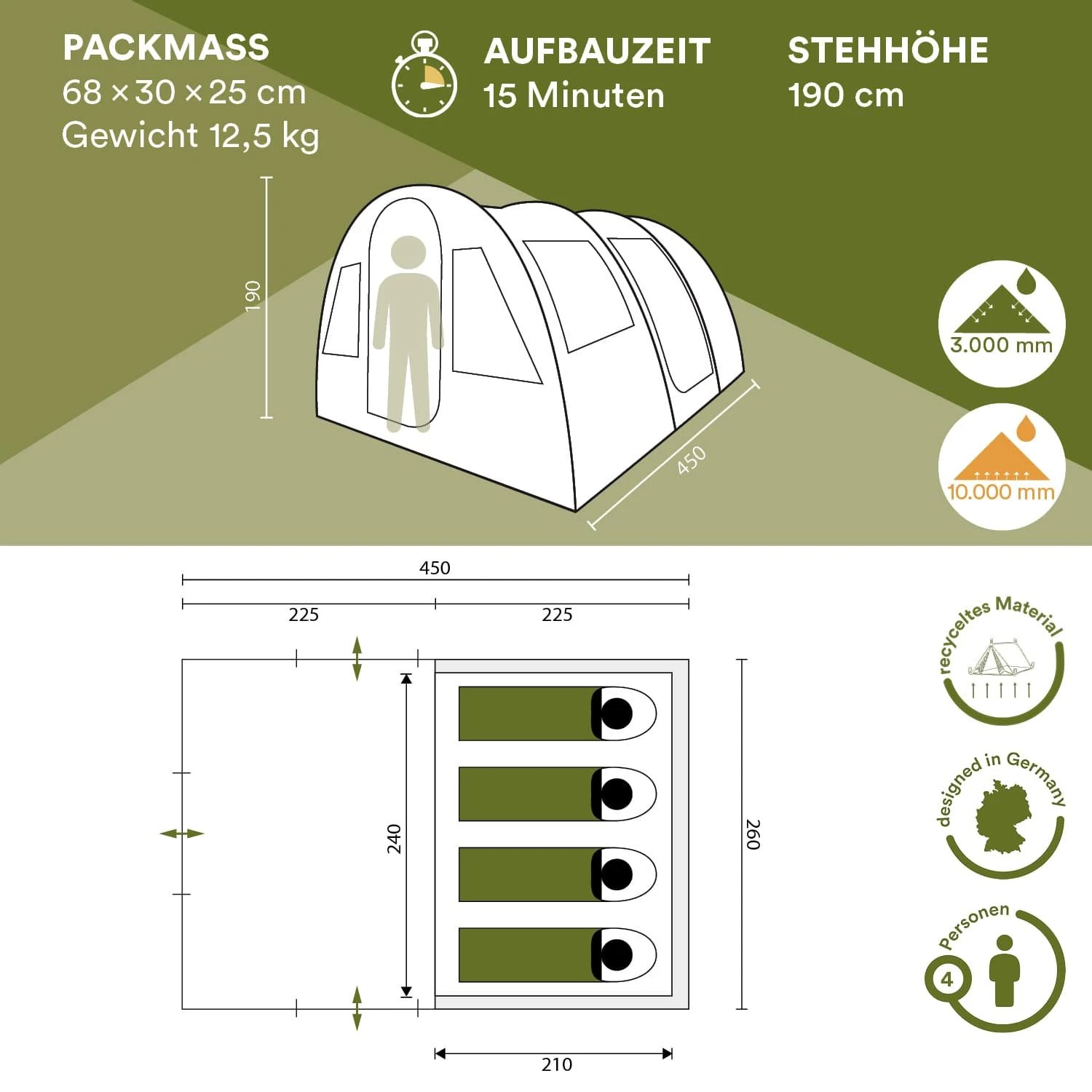 Die bruchsicheren Fiberglasstangen sorgen für einen sicheren Stand, selbst bei starkem Wind. Die extrem hohe Wassersäule von 3.000 mm des PU-beschichteten Materials vom Außenzelt und die sorgfältig versiegelten Nähte bieten darüber hinaus Sicherheit und Komfort, auch bei Sturm und starkem Regen.