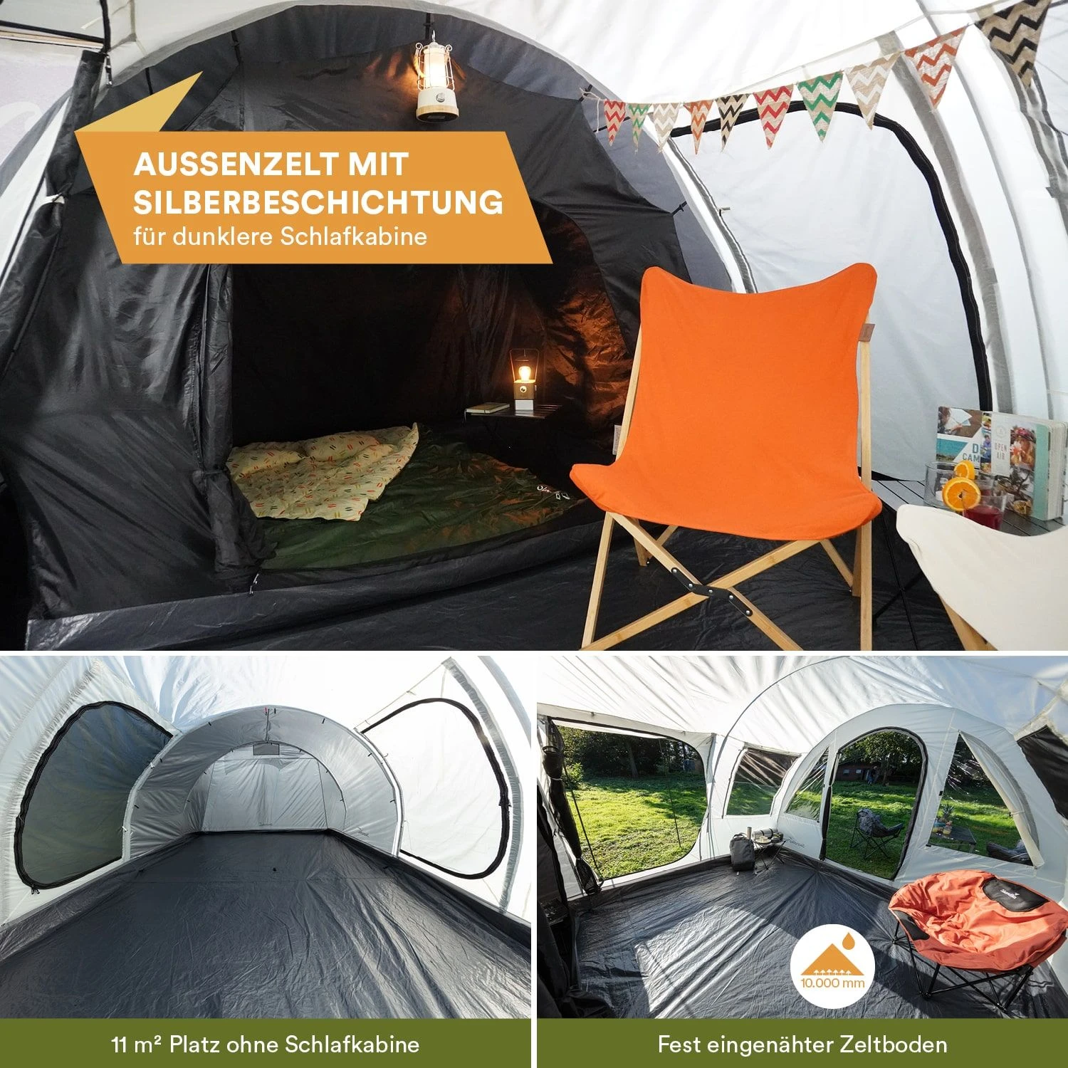 - Große Schlafkabine im hinteren Teil des Zeltes – großer Wohnbereich vorne