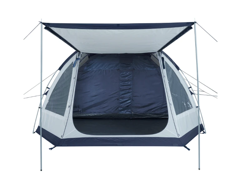 Das Zelt hat vorne einen 7qm großen Wohnbereich, sowie im hinteren Teil einen Schlafbereich für bis zu 5 Personen, der durch einen Vorhang auch nochmal separat in zwei Kammern trennbar ist. Neben dem Vordereingang mit praktischem Aufstelldach verfügt der Wohnbereich außerdem über einen zweiten Eingang an der Seite. Beide Eingänge sind mit Gaze-Doppeltüren versehen, sodass man vor Moskitos und anderen fliegenden Insekten gut geschützt ist.