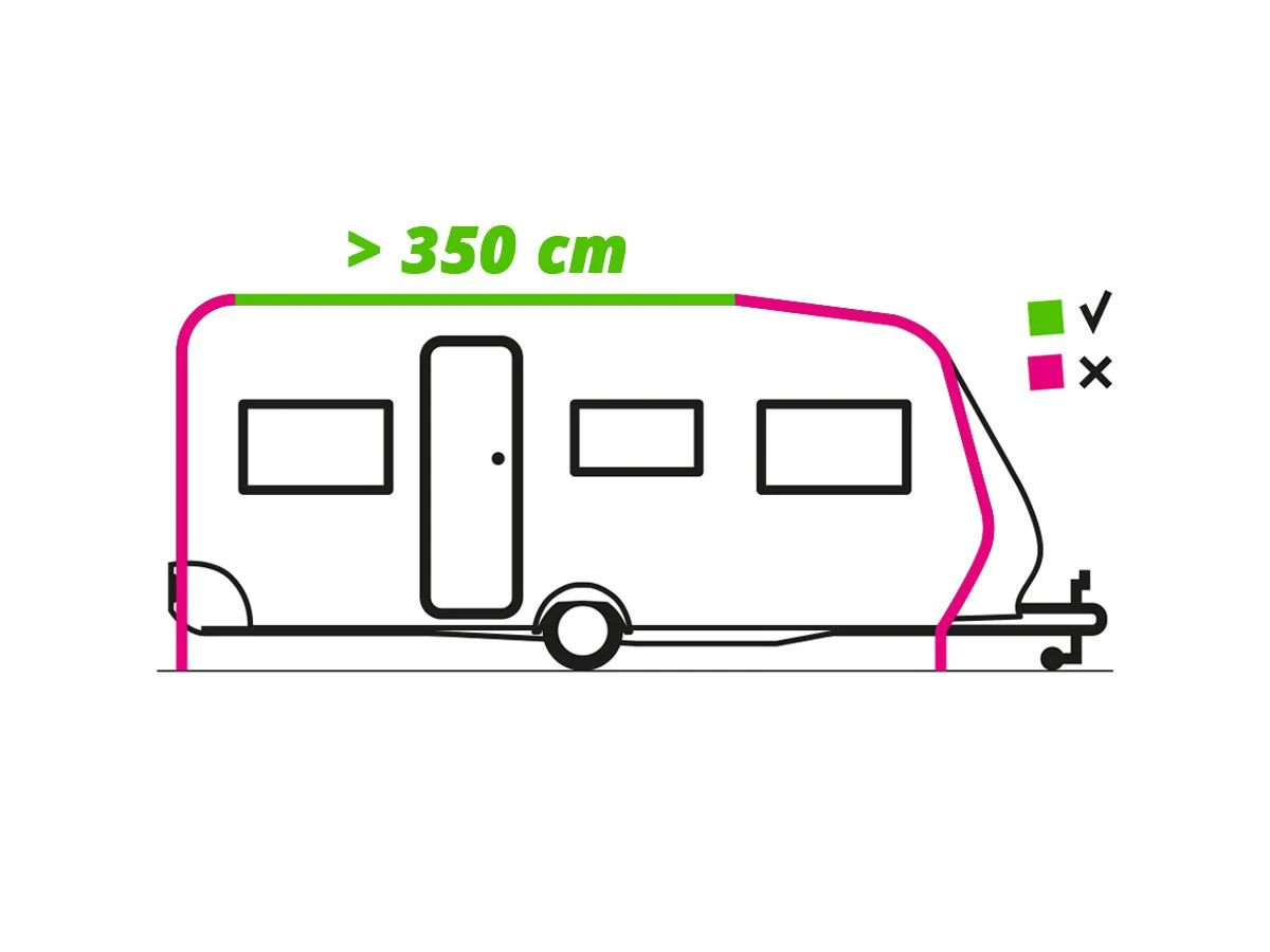 Die Thule Omnistor 1200 passt nur in den geraden Teil Ihrer Wohnwagenschiene. Messen Sie daher bitte immer im Voraus, wie lang dieses Schienenstück ist. Wenn Sie beispielsweise eine gerade Wohnwagenschiene mit einer Größe von 410 cm haben, passt die Omnistor 1200 mit einer Länge von 400 cm perfekt.