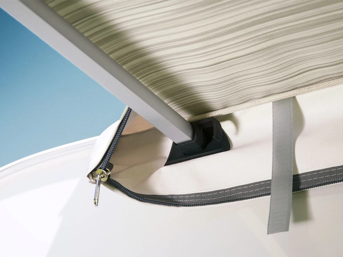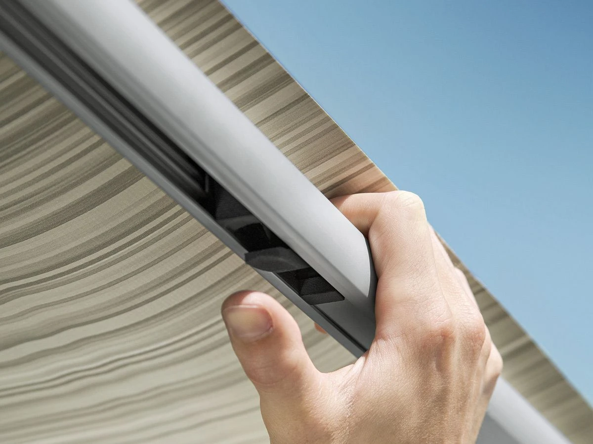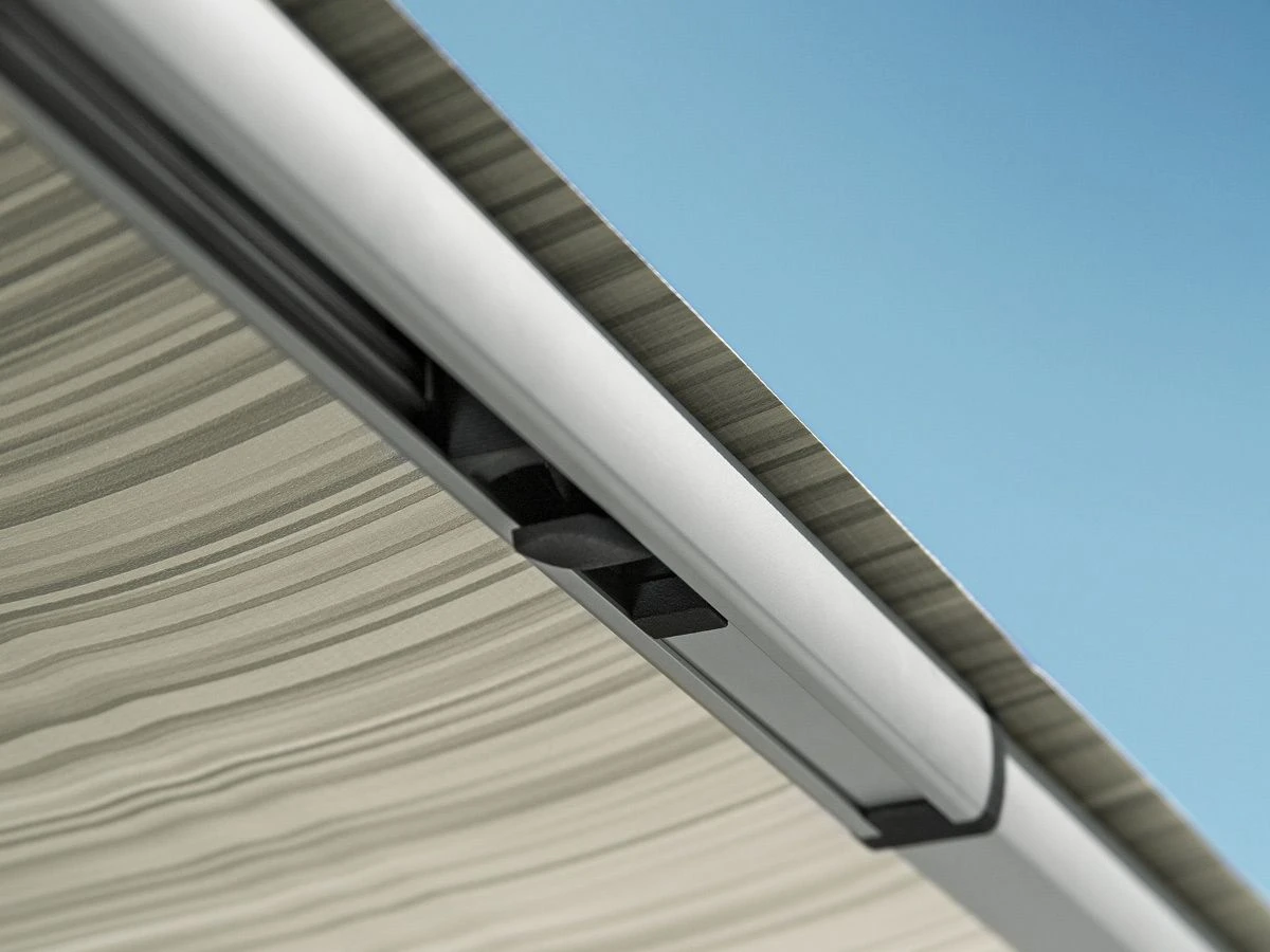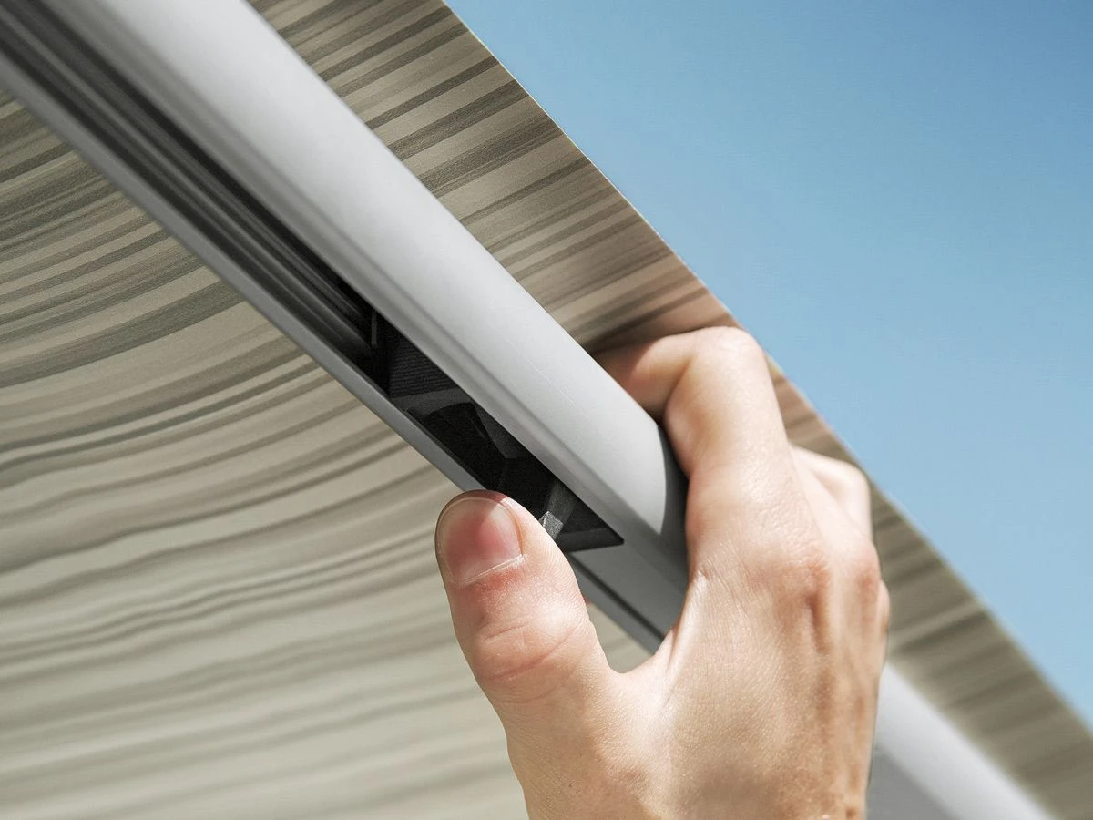 Der Stoff der Thule Omnistor 1200 besteht aus extra starkem PVC und ist dank des patentierten Stoffspannsystems immer besonders gut gespannt. Damit können Sie die Querbalken der Markise immer auf die richtige Spannung bringen. Sie werden demnach nie von einem flatternden Tuch gestört.