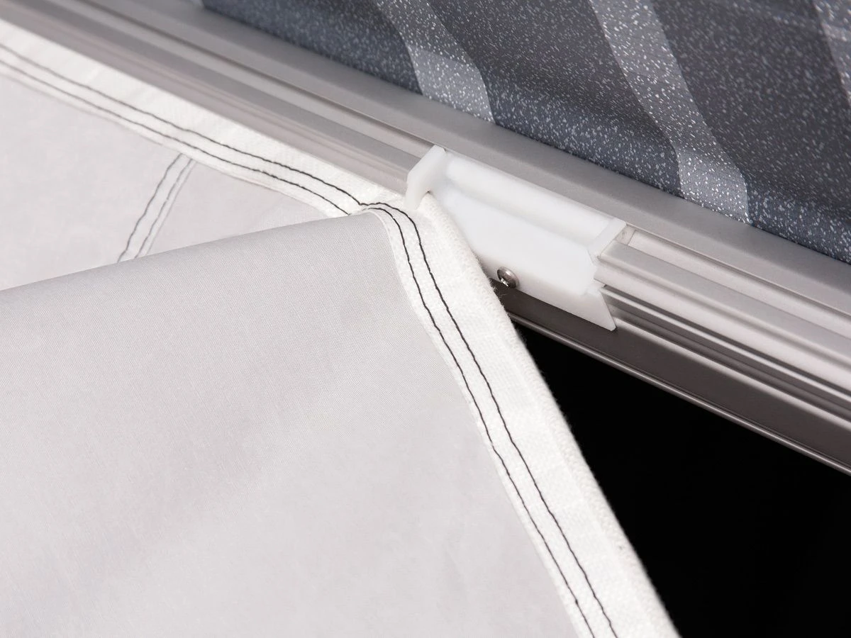 Klicken Sie einfach die Aluminiumprofile des Zeltes in Ihre Markise und anschließend schieben Sie die Seitenwände durch. So stellen Sie eine wind- und wasserdichte Verbindung mit Ihrer Markise her. Auf der Rückseite befindet sich eine Gummilasche, die Sie an der Fahrzeugwand befestigen können. Die Vorderwand des Panorama kann in die Schiene Ihrer Thule Omnistor Markise eingeschoben werden.