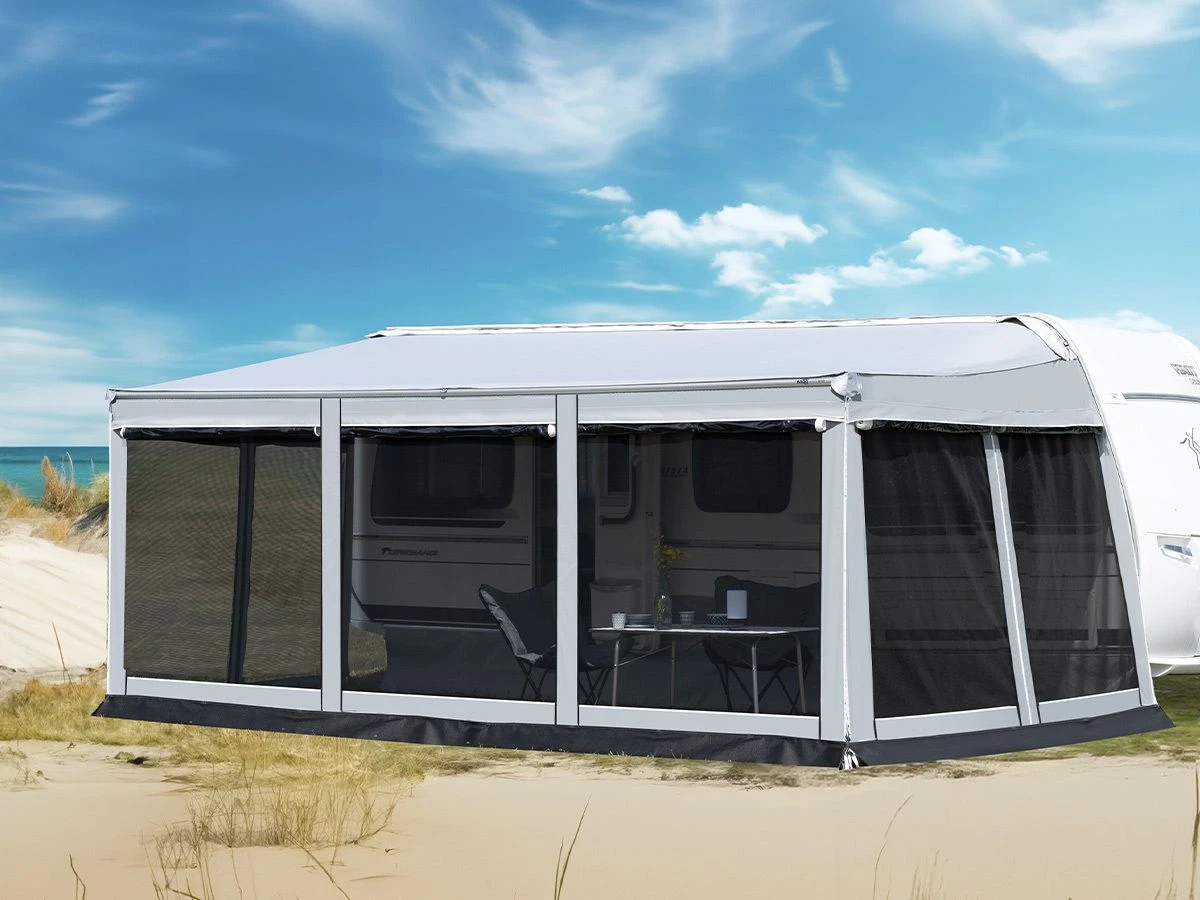 Die Wigo Rolli Plus One Größe 7 (911 – 945 cm) ist eine Sackmarkise, die komplett mit Seiten- und Vorderwänden ausgestattet ist und den gesamten Umfang des Wohnwagens abdeckt. Die Rolli Plus One Größe 7 ist für Wohnwagen mit einem Umlaufmaß von 911 cm bis 945 cm geeignet.